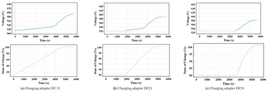 Figure 17 illustrates the electrical behavior of DC fast-charging adapters DC11, DC21, and DC31 during a scenario involving asynchronous electric vehicle charging with a varied initial battery SoC. These adapters correspond to EV1, EV2, and EV3, respectively, operating under time-staggered service conditions that reflect real-world charging patterns.