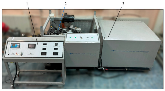 Experimental test rig with GTAT-T003>AT-T009. (1) Command and monitoring panel; (2) diesel engine; (3) dynamometer brake.