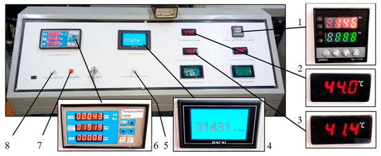 Diesel engine parameter control and monitoring panel. (1) Exhaust gas temperature at engine outlet; (2) engine oil temperature; (3) engine coolant temperature; (4) intake air flow; (5) engine acceleration potentiometer; (6) torque, power and rpm values; (7) dynamometer brake start–stop button; (8) dynamometer brake adjustment potentiometer.
