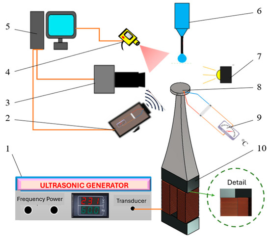 Principle of the magnetostrictive method. (1) Ultrasound generator; (2) temperature acquisition and monitoring equipment; (3) high-speed video camera; (4) thermal imaging camera; (5) computer; (6) stalagmometer; (7) high-power lighting system; (8) magnetostrictive concentrator disk; (9) temperature sensor; (10) frequency concentrator.