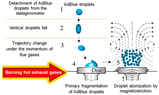 Figure 4 provides a graphical representation of the phenomenological model describing the fragmentation of AdBlue droplets induced by the magnetostrictive effect in presence of a temperature field. At primary fragmentation, the AdBlue droplets are falling and will encounter a flat disk. In the absence of magnetostriction they fragment into droplets in the order of tens of micrometers. When using magnetostrictive phenomena, as stated above, the diameter of the AdBlue droplets is significantly smaller, below 10 μm. At engine start-up the gases are cold, but after a certain time due to the heating of the gas flow the phenomenon of calefaction occurs. The phenomenon of calefaction is characterized by an intense vaporization at the surface of a liquid if it is next to a heated solid body, without direct contact. Experimentally, the metal disk heated by forced convection reached temperatures between 453 and 873 K.