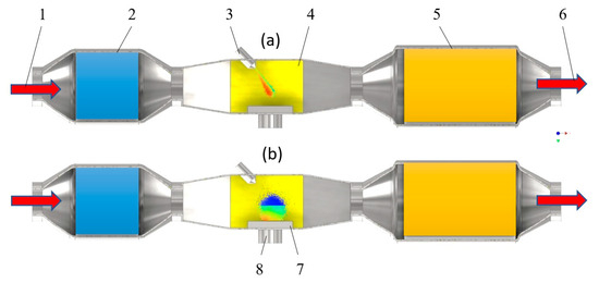 Design concept of the SCR system with magnetostrictive element: (a) Injection of the AdBlue solution and (b) Atomization of the AdBlue jet by magnetostrictive effect. (1) Diesel engine exhaust gases; (2) diesel particulate filter (DPF); (3) AdBlue injection zone; (4) mixing zone; (5) SCR system; (6) outlet port; (7) disk for primary fragmentation; (8) upper part of the magnetostrictive concentrator.