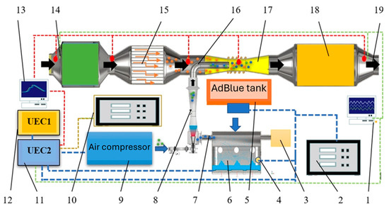 Block diagram of the piezoelectric cell-based SCR system configuration used experimentally. (1) Gas analyzer for monitoring flue gas parameters (NOx) after SCR; (2) data acquisition interface; (3) valve; (4) level sensor; (5) AdBlue tank; (6) vapor accumulation chamber; (7) suction port; (8) piezo cells; (9) air compressor; (10) display; (11) AdBlue electronic control unit UEC2; (12) diesel engine electronic control unit UEC1; (13) data acquisition system; (14) DOC; (15) DPF; (16) ejection system diffuser; (17) Venturi tube; (18) SCR; (19) exhaust.