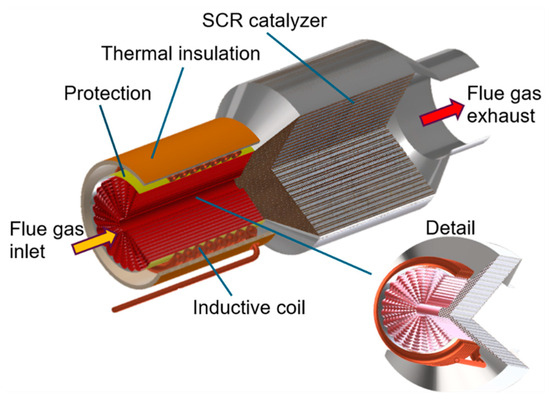 As the urea decomposition temperature needs to be strictly controlled, an inductive preheating system has been implemented inside the SCR piping. This system is designed to rapidly increase the temperature of the exhaust gas and pipe when the diesel engine is running cold, which in turn enhances the vaporization of AdBlue droplets. Previously developed preheating systems have been mainly applied for direct heating of the SCR catalyst. In contrast, the system shown in Figure 7 is a module for preheating the flue gas upstream of the SCR. It consists of an inductive coil, which applies the principle of electromagnetic induction to a metal honeycomb through which the cold flue gas flows. The system is used only for diesel engines that are considered “cold”.