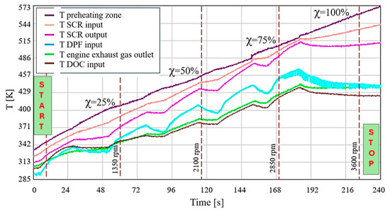 Using the preheating system, an engine test cycle was carried out under full load conditions (Figure 8), which generated a significant temperature increase in the SCR honeycomb area. In the following analysis, χ is used to denote the engine load coefficient, expressed as the ratio between the applied engine load and the maximum available load (in %), allowing direct comparison of NOx values across different operating regimes.