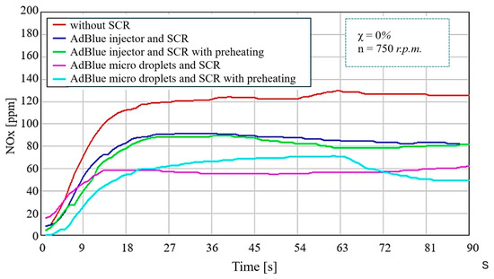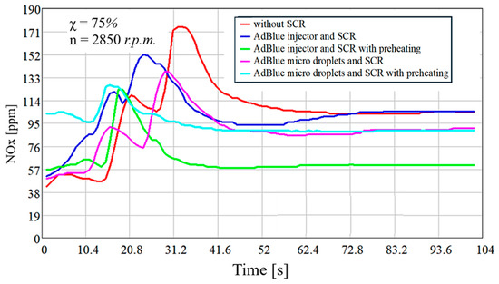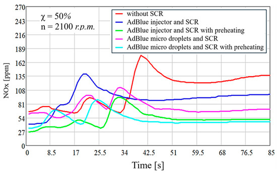 Subsequently, a comparative analysis of NOx was carried out for different configurations of the exhaust manifold of the diesel engine with and without SCR. The graphs shown in Figure 9 represent the comparative NOx values obtained during the tests for five configurations (see figure legend): diesel engine without SCR, diesel engine equipped with SCR and AdBlue injection, with and without preheating, SCR with addition of magnetostrictively atomized AdBlue micro droplets or piezoelectric cells aspirated by ejection, with and without preheating.