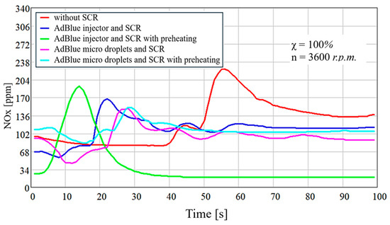 As shown in Figure 10, in each case there was a sudden increase in NOx immediately after the start of the measurements, when the highest values appeared. This occurred when the dynamometer brake was applied and the diesel engine started braking. When the NOx generation rate stabilized, the values were close: 109 ppm for the engine without SCR, compared to 99 ppm for the engine equipped with SCR and AdBlue injection. The lowest value of 12 ppm is obtained when using the system with piezo cells and preheating when it is expected that the AdBlue vapors, due to their uniform distribution in the exhaust gas, would absorb part of the NOx. This assumption is possible since chemical conversion is favored by preheating reaching values above 473 K.