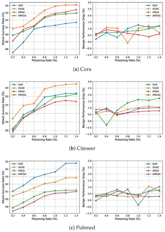 Among these methods, models like Graph Auto-Encoder (GAE) and Variational Graph Auto-Encoder (VGAE) [] are classic benchmarks for link prediction. To further improve representation quality, subsequent works introduced adversarial regularization, leading to models like ARGA and ARVGA []. These models use a discriminator to constrain the latent distribution of node embeddings, making them more robust. Due to their excellent performance on multiple benchmark datasets, these models are also common targets for evaluating the effectiveness of graph attack algorithms.