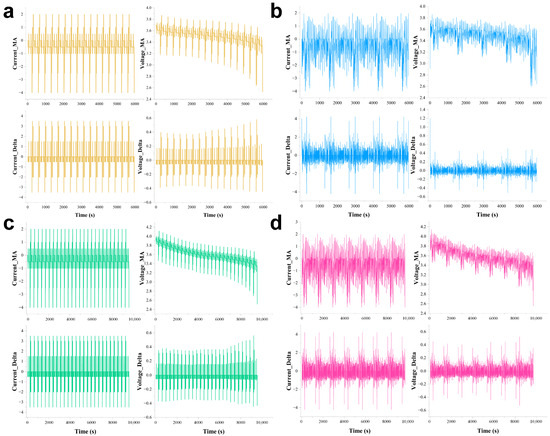 To enable the model to effectively capture both the original and dynamic characteristics of the voltage and current time series, a feature expansion operation was performed. Specifically, moving average values of the voltage and current were calculated using a three-point sliding window, resulting in two new features: Voltage_MA and Current_MA. Additionally, the rate of change for both voltage and current was computed to generate the features Voltage_Delta and Current_Delta. The three-point window was selected to achieve an optimal balance between computational efficiency and the sensitivity to capture rapid transient behaviors in battery dynamics, a common practice in the related literature for BMS applications [18]. As a result, the model’s input comprises six independent variables: I, U, Voltage_MA, Current_MA, Voltage_Delta, and Current_Delta. The distributions of the four additional features after training set expansion are illustrated in Figure 1.