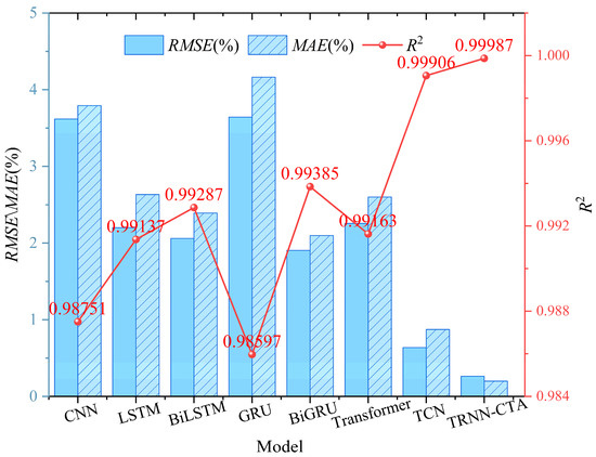 To intuitively illustrate the advantages of the proposed model, a visualized bar chart of the comparative results is presented in Figure 4. As shown, the traditional CNN exhibits the weakest modeling capability due to its inability to effectively extract temporal dependencies, resulting in an R2 value below 0.99. Although the unidirectional LSTM and GRU models demonstrate some capacity to capture temporal information, their performance remains limited by their failure to account for bidirectional temporal dependencies. For example, the GRU model still records an R2 lower than 0.99. In contrast, bidirectional RNN models show notable improvements in accuracy. While BiLSTM achieves a slightly lower R2 than LSTM, it shows enhanced error metrics, with RMSE decreasing from 2.201% to 2.062% and MAE from 2.634% to 2.392%. The BiGRU model, in particular, demonstrates a more substantial reduction in error indicators compared to its unidirectional counterpart. However, even these enhanced models exhibit RMSE values that are 6–8 times higher than those achieved by the proposed TRNN-CTA framework, underscoring its superior modeling performance. In summary, TRNN-CTA leverages a dual-branch feature extraction and fusion structure to facilitate multi-scale temporal feature integration. Coupled with the context-based CTA mechanism, which dynamically focuses attention on key temporal segments, the model effectively addresses the limitations of traditional RNNs, particularly their challenges in capturing long-term dependencies and detecting localized fluctuations. These experimental findings further reinforce the effectiveness and advancement of the proposed TRNN-CTA framework through a comprehensive horizontal model comparison.