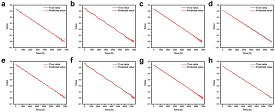To provide an intuitive understanding of the model’s predictive performance, the predicted values and true values for all eight experimental scenarios were plotted, with time represented on the horizontal axis. The results are illustrated in Figure 5. As shown, the model demonstrates a strong overall fitting performance under all tested conditions, indicating that the SOC prediction accuracy at 50% capacity is high. However, a closer examination reveals tail-end fluctuations in the prediction results across all conditions. This phenomenon is attributed to the nonlinear instability of battery SOC behavior when the SOC falls below 20%, a known challenge in battery modeling. As a result, many prior studies adopt a 20% SOC cut-off as a standard threshold for reliable prediction and evaluation [29].