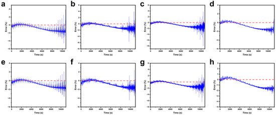 Figure 6 illustrates the discrepancies between the predicted SOC values and the actual values presented in Table 7. A consistent pattern can be observed across all scenarios: The model tends to overestimate the SOC during the initial period (approximately 0–3000 s), and underestimate it in the subsequent phase (3000–9000 s). Beyond 9000 s, the prediction errors exhibit increased fluctuation, with the error values initially remaining relatively stable before gradually increasing. This trend suggests that the model’s prediction accuracy decreases over extended time periods, possibly due to accumulated temporal drift or increased complexity in battery behavior at later stages of operation.
