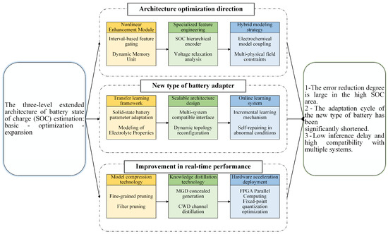Schematic diagram of the three-level expansion architecture of basic–optimization–expansion for battery charge state SOC estimation.
