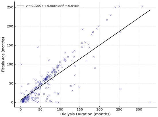 Correlation between dialysis duration and fistula age (n = 246). A strong positive linear association was observed (r = 0.81). The regression line and corresponding R2 value are shown.