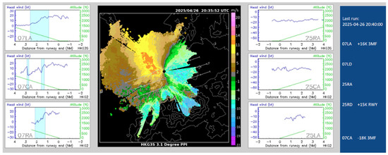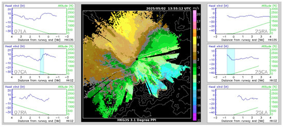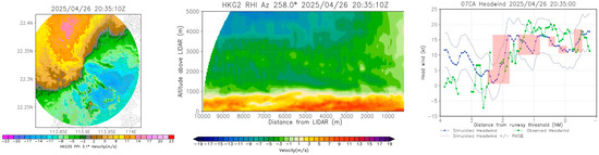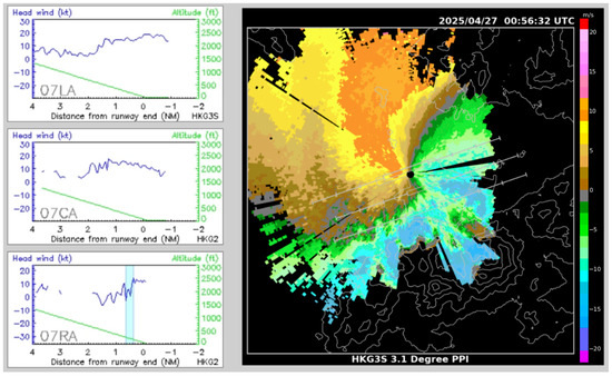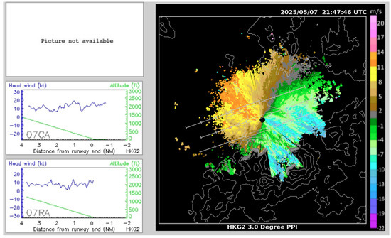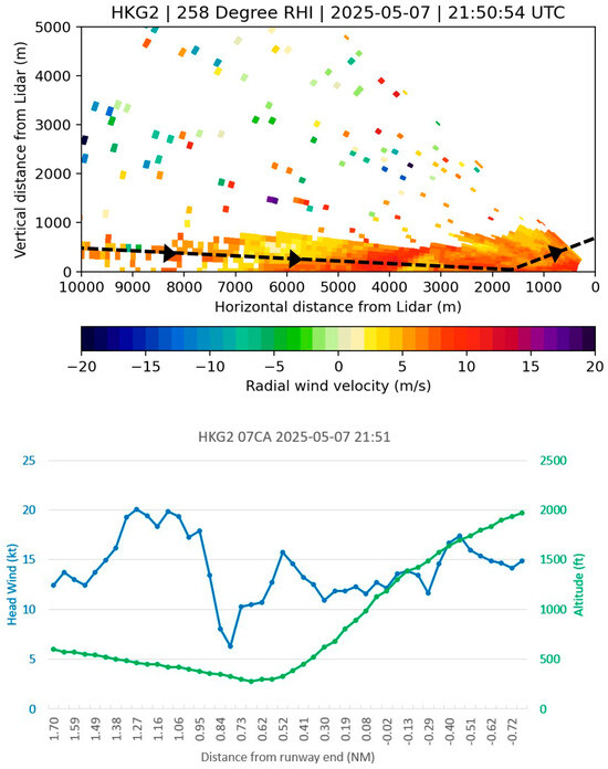 In terms of the flow pattern at the airport region, this case is similar to Case 1, i.e., as shown in the PPI scan in the upper panel of Figure 15, together with the associated headwind profiles. The special feature of this case is a pilot windshear report of −40 knots (headwind loss) at a height of 100 feet over 07CA at 2151 UTC, 7 May 2025, leading to a missed approach. This magnitude of headwind loss is not apparent from the headwind profile of the LIDAR, as well as the RHI scan, as shown in the middle panel of Figure 15. From the RHI scan, an outbound easterly flow prevails over the 07CA runway corridor, with a slightly weaker wind above the strong outbound flow, i.e., between 5000 m and 7000 m from the LIDAR. The flight path of the aircraft is overlaid on this RHI scan, and the headwind is derived with the headwind profile shown in the lower panel of Figure 15. As such, apart from the headwind profile obtained from the glide path scans of the LIDAR, the RHI scan data are used for the first time to derive the headwind profile as well. However, there is only a headwind loss of around 15 knots, from around 20 knots to 5 knots. The RHI data also do not show headwind loss up to 40 knots.