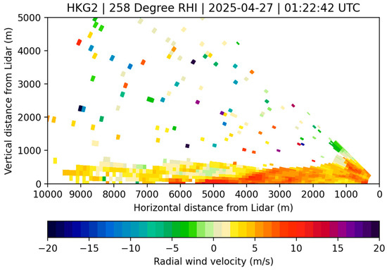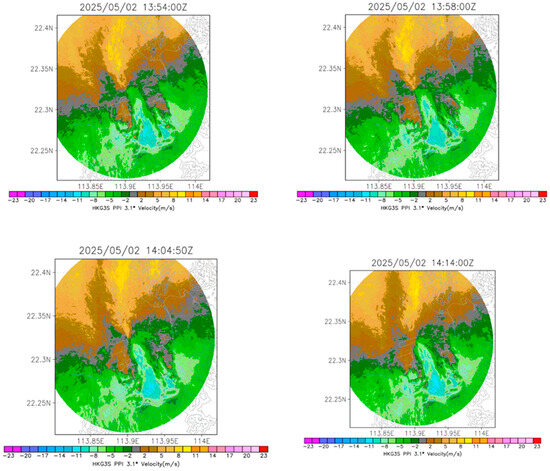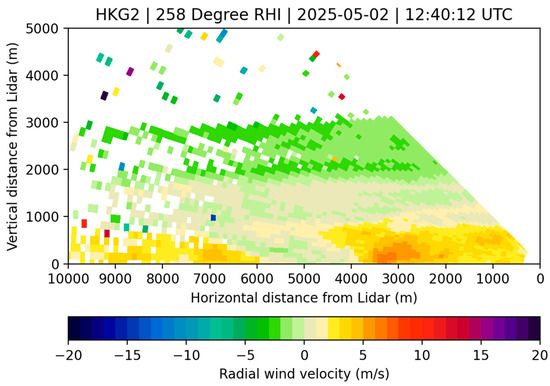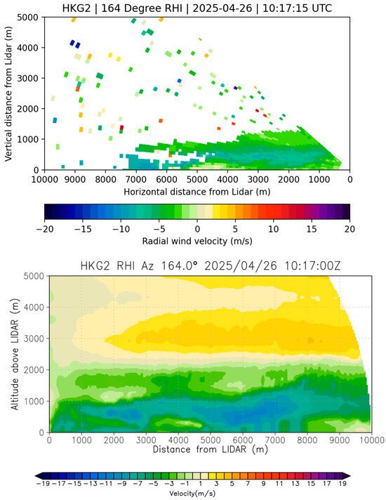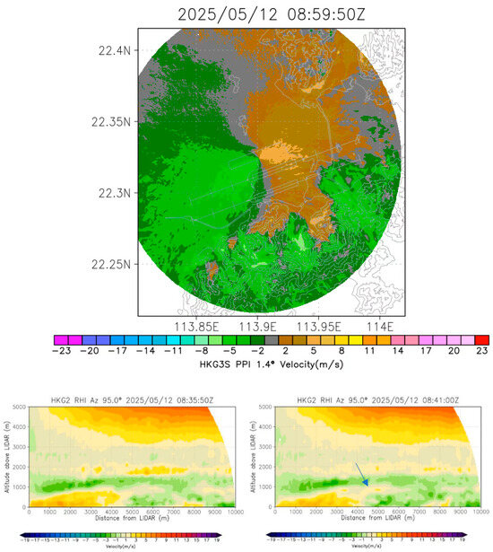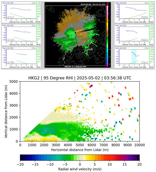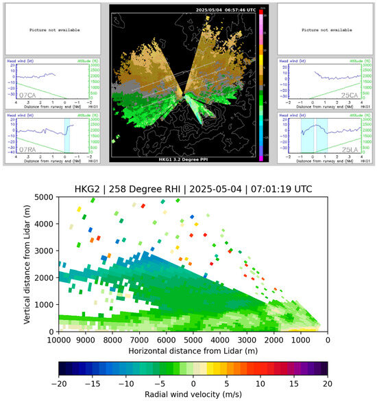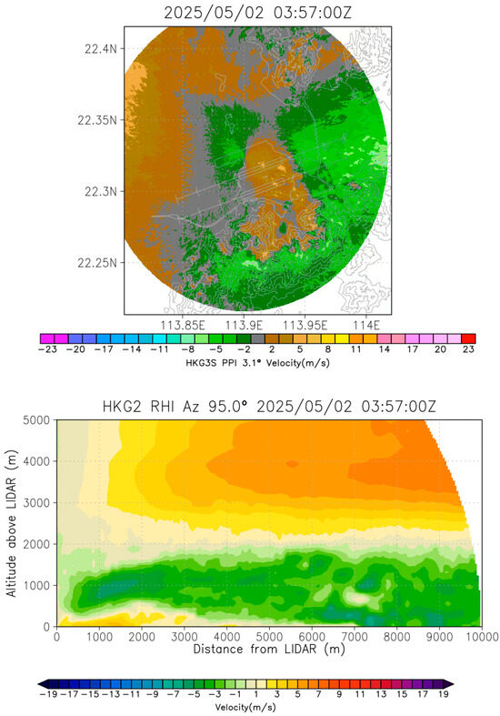 At around noon on 2 May 2025, a surge of easterly winds arrived at Hong Kong and gradually extended from the eastern to the western part of the territory. It reached the airport region at around 04 UTC on that day (which was around noon time, with Hong Kong time = UTC + 8 h). The LIDAR observations around that time are given in Figure 6. At that time, southwesterly winds prevailed over the airport, and the easterly winds set in from the east, as shown by the PPI scan image of the LIDAR in the middle of the upper panel of the figure. The interface of the two airmasses resulted in low-level windshear, as shown in the highlighted (blue) regions in the headwind profiles obtained by the LIDAR (on the two sides in the upper panel of the figure). The RHI scan to the east of the airport is shown in the lower panel of Figure 6. The interface of the two airmasses is clearly shown, with the outbound flow associated with the background southwesterly and the inbound flow associated with the easterly. The easterly seems to flow over the background southwesterly, and waves could be identified at the interface between the two airmasses in the vertical cross-section.
