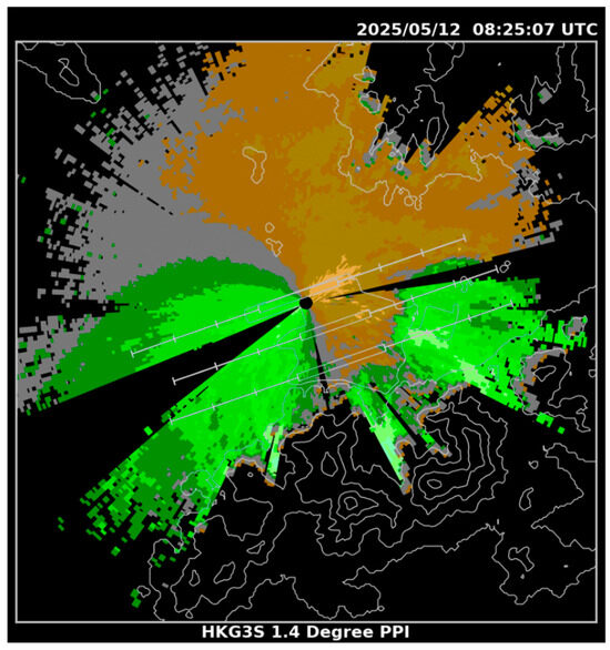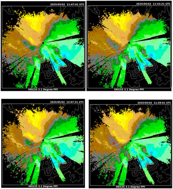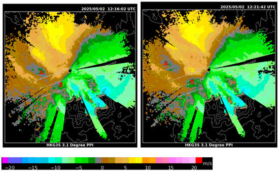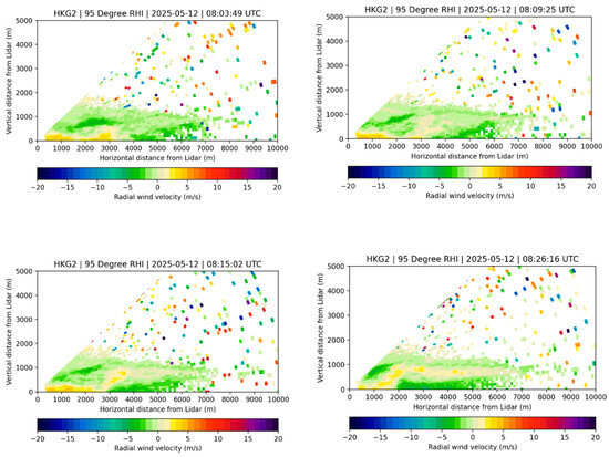 In the late afternoon of 12 May 2025, a southwesterly prevailed over the airport region. With abundant sunshine, easterly sea breeze set in over the eastern part of HKIA. The PPI scan at that time is shown in the upper panel of Figure 20. The convergence between the background southwesterly and the easterly sea breeze could have led to low-level windshear, although there were no pilot reports of windshear for this case. However, from the RHI, it is observed, for the first time, that the setting in of the sea breeze (inbound flow in green) uplifted the background southwesterly (outbound flow in yellow), as shown in the sequence of RHI scans in the lower panel of Figure 20. The lifting is possibly due to the slightly cooler airmass associated with the sea breeze.