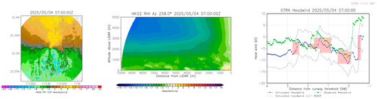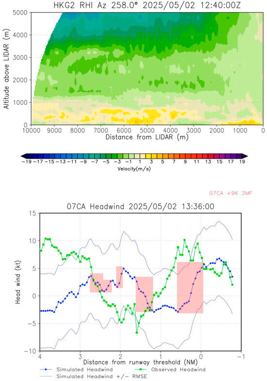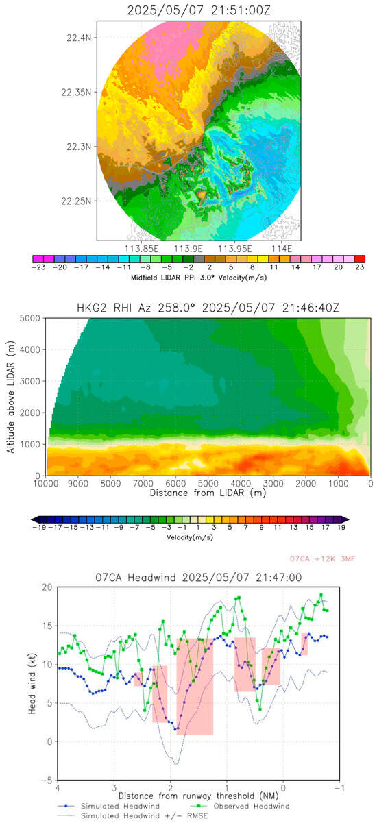 Moderate to fresh southerly winds prevailed over the airport region on 4 May 2025. The prevailing winds penetrated through three major valleys of the mountainous terrain on Lantau Island to the south of HKIA, namely the gap at the eastern part, center part, and western part of the island. After passing through these gaps, the southerlies converged over the airport island. A snapshot of the Doppler velocity image of the LIDAR is shown in the middle of the upper panel of Figure 12. As a result of the airflow convergence, low-level windshear occurs rather close to the runway ends, as highlighted in blue in the headwind profiles on the two sides of the upper panel of Figure 12. On that day, there were two pilot windshear reports over 07RA, at 0640 UTC and 0702 UTC. Both reported encountering headwind gains of 15 to 20 knots at a height of about 300 feet, at about one nautical mile from the runway end. They had conducted a missed approach because the windshear was very close to the runway end.