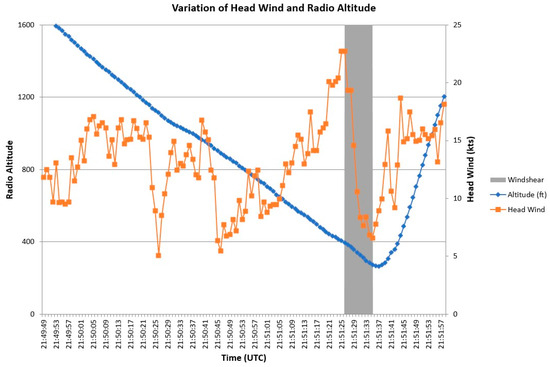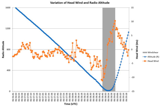 The flight data are shown in Figure 16. The headwind profile is shown in the upper panel, and the windshear (highlighted in grey) is only about 16 knots of headwind loss. The data are shown in detail in the lower panel of Figure 16, with the EDR reaching about 0.4 m2/3s−1 (moderate to severe turbulence) and vertical wind in the region of +5 m/s (upward motion) and −3 m/s (downward motion). Pilot windshear reports are more subjective, and the estimation of headwind changes is difficult, possibly making reference to the airspeed changes. The severe windshear reported in this case may be related to the rather abrupt loss of headwind near the runway end, together with the occurrence of moderate to severe turbulence.