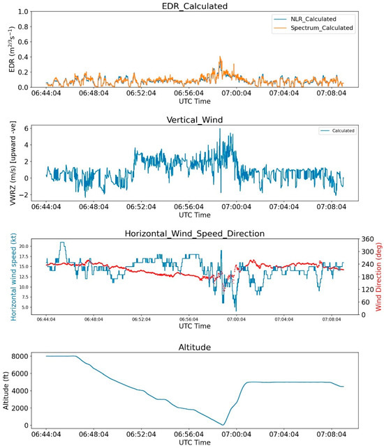 A sample set of flight data with a pilot windshear report is shown in Figure 3. Because of the terrain disruption of the airflow, multiple occurrences of significant headwind changes could be identified (highlighted in grey), as seen in the upper panel of Figure 3. The headwind changes had a magnitude of around 15 knots and could have been headwind gain or headwind loss. The flight data have been analyzed by the WINDSTURB algorithm [15], as well as the in-house-built software within HKO according to WINDSTRUB and the methodology described in Huang et al. [16]. The results are shown in the lower panel of Figure 3, including the eddy dissipation rate (EDR), as well as the vertical wind. There are discrepancies in the outputs from the two algorithms, but vertical winds have the largest magnitude of around 4 to 6 m/s, and the maximum EDR is in the region of 0.2 to 0.4 m2/3s−1, i.e., moderate turbulence. The mountain wake flow may have created an additional workload for the pilots.