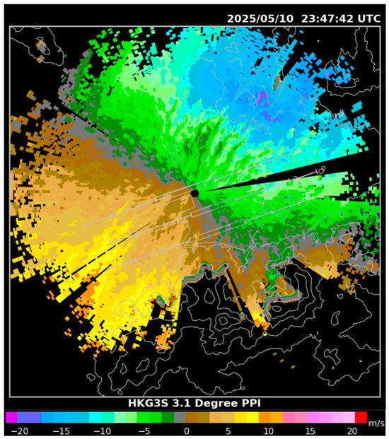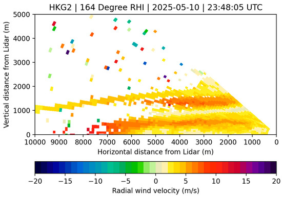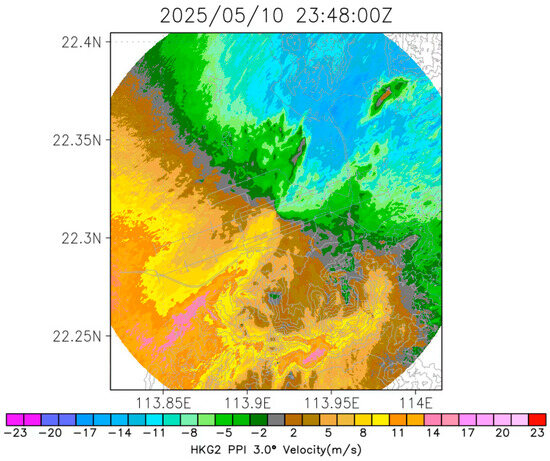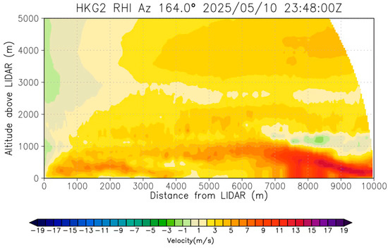It is not common to have strong northeasterly winds in Hong Kong as late as May (late spring), and one such case occurred on 10 May 2025. There are no windshear reports in this case. The LIDAR PPI image is shown in the upper panel of Figure 18. A disturbed flow appears as the background, strong northeasterly winds flow over and past the terrain to the north and northeast of HKIA. In the RHI scan of the LIDAR, at an azimuth angle of 164 degrees, an outbound (background northeasterly) jet first appeared at a height of around 500 m above sea level near the LIDAR and descended to near the ground at a distance of about 6000 m to 7000 m from the LIDAR. This descending has never been observed in Hong Kong before.
