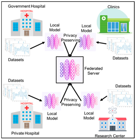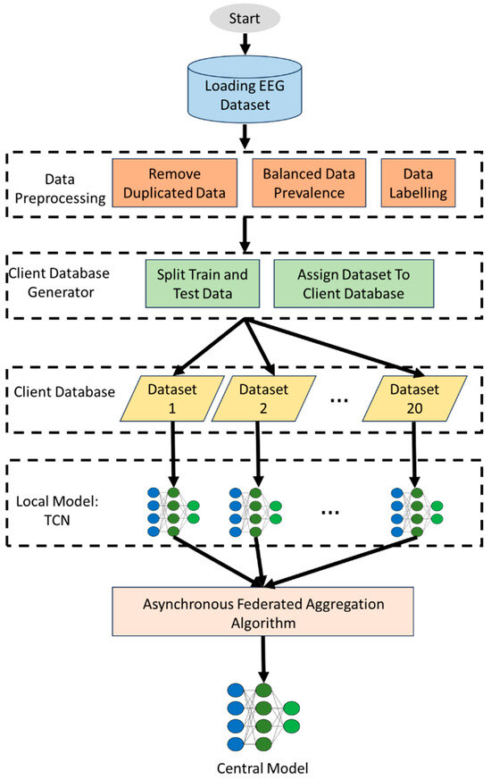 The hand-crafted features (e.g., spectral power, entropy) and shallow classifiers (e.g., Random Forest, Extreme Gradient Boost (XGBoost) [10], Support Vector Machine (SVM), Gaussian Naive Bayes [11]) were used in the traditional machine learning technique of seizure classification. Pankaj et al. conclude that Random Forest can achieve classification performance with remarkable results, including an F1 score of 0.943 and an accuracy of 0.977 [10]. Ranjani et al. consider different machine learning algorithms (SVM, Random Forest, Gaussian Naive Bayes, and K-Nearest Neighbors) to classify seizures using EEG signals from the University of California Irvine (UCI) dataset, achieving accuracy rates of 0.98, 0.96, and 0.93, respectively [11]. However, these techniques could be interpreted; they found it difficult to apply them effectively to different patient populations. Deep learning has caused a revolution, where Convolutional Neural Networks (CNNs) [12] and Long Short-Term Memory networks (LSTMs) [13] are able to correctly predict spatiotemporal EEG patterns with 98.40% and 98% accuracy, respectively. Capturing long-range dependencies via dilated convolutions, Temporal Convolutional Networks (TCNs) were subsequently proposed as a promising alternative, allowing for parallel processing and capturing long-range dependencies [8]. These architectures, however, typically require centralized data collection of EEG data, which raises a privacy concern due to medical data regulations [14].