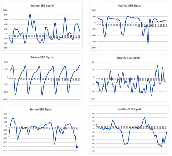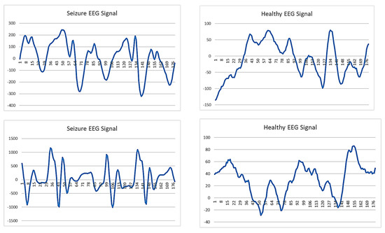 Figure 3 displays the EEG signals of a seizure and a healthy person. The difference can hardly be observed from the EEG signals. The visual inspection of the EEG signals, as shown in the five figures of seizure EEG signals on the left and the five figures of healthy EEG signals on the right, reveals no clear or consistent patterns that can be easily distinguished between the two classes. Both seizure and healthy EEG signals exhibit highly irregular and randomized patterns, with significant variability even within the same class. This lack of visually discernible features makes it extremely challenging to differentiate seizure EEG signals from healthy ones based solely on observation. Consequently, manual analysis is unreliable, and the use of advanced artificial intelligence (AI) techniques becomes essential to extract subtle, complex features and achieve accurate classification of the EEG signals.