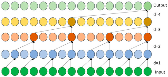 Dilated causal convolution process in the TCN. Each convolution layer uses a dilation factor (d = 1, 2, 4, 8) to capture progressively longer temporal dependencies in EEG signals.