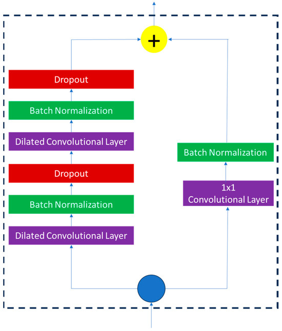 It begins with two steps: starting with temporal feature extraction and ending in classification through architecture in the last few layers. First, a 1 × 1 convolution can decrease the temporal data from 128 channels in a time window to 64 channels, but sustains the same duration in time. Features are flattened and passed to a layer with a Softmax activation to categorize seizures as either binary or non-seizures. Such a design reduces more temporal information than global pooling designs; thus, the model is sensitive to short epileptic activity. A combination of dilated convolutions, residual learning, and a judicious reduction in dimensionality represents an efficient and robust architecture with the ability to outperform fixed-dimension RNNs on the tasks of long EEG sequence processing, and is more computationally efficient than similarly structured CNNs, on the problem of temporal classification. The TCN that was implemented represents an optimal trade-off in terms of its temporal resolution, model complexity, and performance in classification against the seizure detection task. The residual connection in the TCN model is depicted in Figure 5.