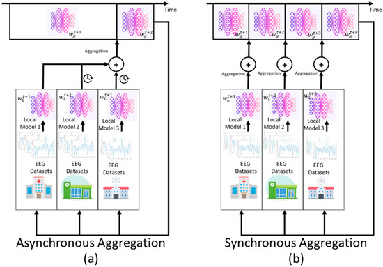 (a) Asynchronous aggregation process; (b) synchronous aggregation process in federated learning.