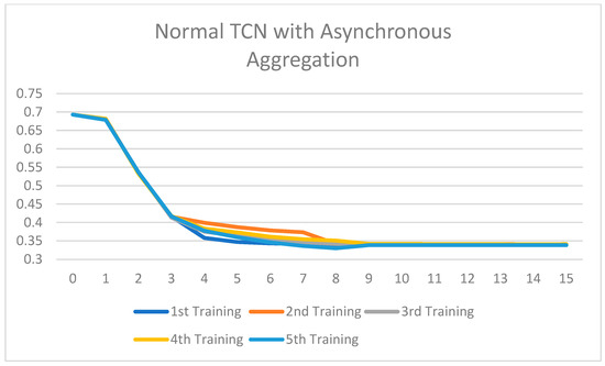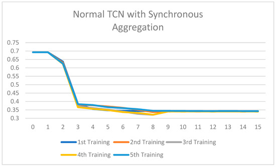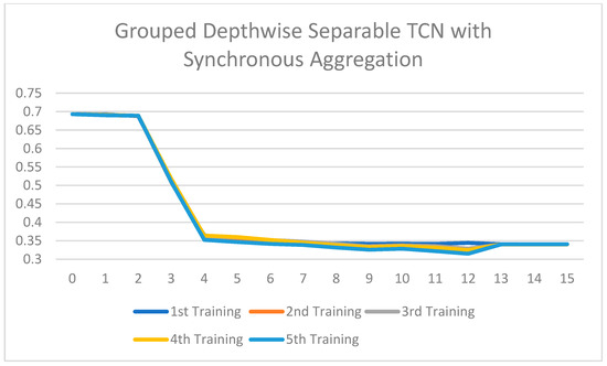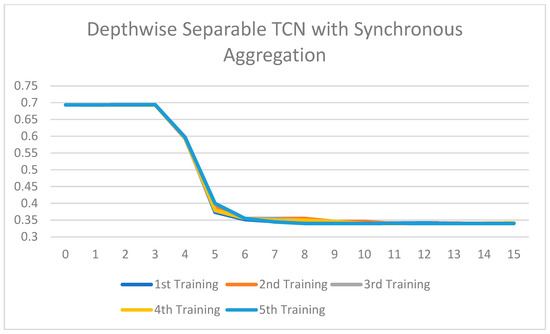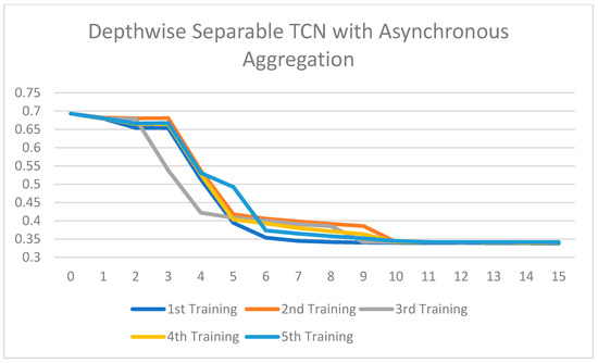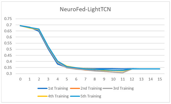 The synchronous vs. asynchronous results agreement is excellent: in every model, there was a corresponding decrease in training time by degrees of 3.6 to 18%. The Normal TCN has the most significant benefit (18% faster), since asynchronous aggregation will reduce the computational bottlenecks of the dense operation in the normal TCN, and the Depthwise Separable TCN has the least (3.6%) because it is already quite efficient. With grouped convolution, the proposed NeuroFed-LightTCN achieves a 13.5% improvement, while balancing the model architecture complexity and asynchronous scalability. These findings suggest that asynchronous aggregation is particularly beneficial for heavier models and offers diminishing returns for streamlined designs. Subsequently, the training loss of each model after 15 training runs is presented in Figure 7, Figure 8, Figure 9, Figure 10, Figure 11 and Figure 12.