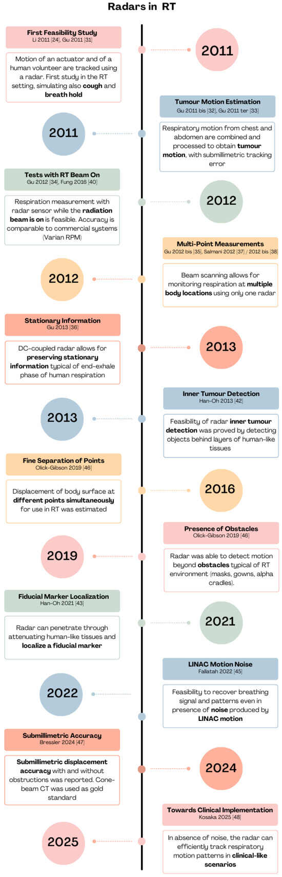 The paragraph ends up with a section dedicated to the use of radars for motion management in medical imaging applications, being a pillar of RT workflow. The following subparagraphs highlight differences in experimental setups, in the choice of objects to be tracked, in the measures performed, and in the gold standards used, and report main results towards clinical implementation in a real RT environment. Table 1 summarizes all these findings, while Figure 1 highlights milestones achieved.
