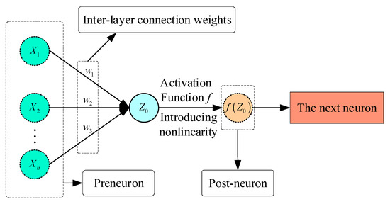 The BP neural network primarily establishes the internal rules governing the relationship between input features and output features by means of two sequential processes: forward propagation and backward propagation. The BP neural network’s forward transmission multiplies the output of each neuron in the last layer by the matching inter-layer weight and then perform a linear operation to obtain the parameter , as shown in Equation (13). Then, substitute the parameter into the activation function , introduce nonlinearity, and finally pass the result to the next neuron, as shown in Figure 2.