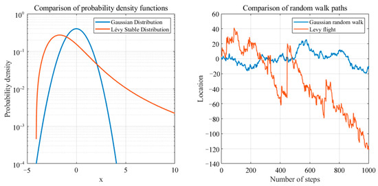 As can be seen from the aforementioned formula, the adopted Levy flight strategy adjusts step sizes by generating random numbers. Figure 3 illustrates the probability density function and random walk path of Levy flight when . By comparing it with the Gaussian distribution, it is evident that Levy flight exhibits pronounced characteristics of a heavy-tailed stable distribution, with its random walk step sizes comprising numerous small steps interspersed with occasional large jumps.