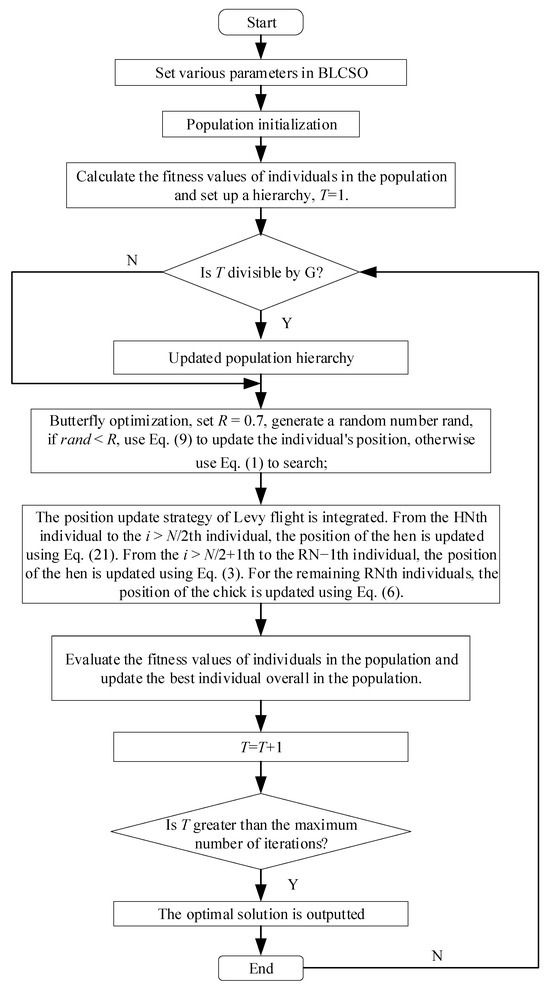 The CSO algorithm is a type of bionic intelligent algorithm, and its design is inspired by the foraging behavior and social hierarchy characteristics of poultry groups [47]. This algorithm divides the chicken swarm into multiple subgroups, with each subgroup following a composition pattern of “1 rooster + N hens + M chicks”. Here, the values of N and M are dynamically adjusted based on the total swarm size and the preset ratio parameter of hens to chicks. Within the swarm, there exists a hierarchical learning mechanism, where higher-ranking individuals exert behavioral guidance on lower-ranking ones, while collaborative and competitive relationships exist among individuals of the same rank. Additionally, competitive dynamics are also present among different subgroups. This dual-competition mechanism effectively enhances the algorithm’s global search capability.