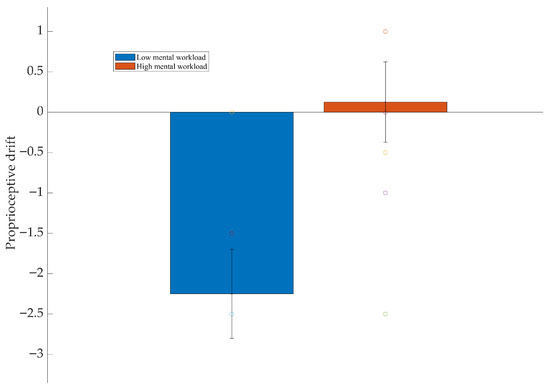 Proprioceptive drifts corresponding to low and high mental workload. The colored circles correspond to the PD value of each individual subject.