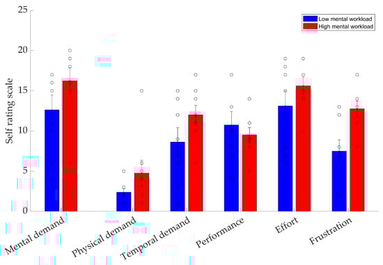 After completing the task, the participants were asked to fill out the NASA Task Load Index (NASA TLX) questionnaire [28], which is a widely used subjective workload assessment tool developed by the Human Performance Group at NASA Ames Research Center. It is designed to evaluate perceived workload in a variety of domains, including aviation, healthcare, and other complex task environments. The tool was originally developed for the assessment of workload in aviation, but it has been adapted for use in different fields.