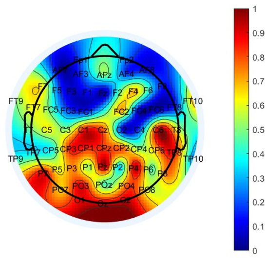 Scalp distribution of p values of the t-test between one-back and two-back conditions.
