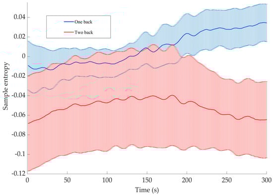 Figure 5 illustrates the variation of Sample Entropy over time for the Rubber Hand Illusions after one-back and two-back conditions. The blue curve represents the one-back condition, while the red curve corresponds to the two-back condition. Shaded regions indicate the variability (standard errors) for each condition.