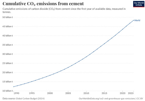 As a global community of engineers, scientists, and builders, we are the architects of the modern world. The very fabric of our civilization—our cities, transport networks, and shelters—is built upon material of our own making: cement and concrete. Yet, we must now confront the profound consequences of our success. Let us begin with an uncomfortable fact about our current reality: the worldwide yearly production of concrete is projected to increase from 14 billion cubic meters today to 20 billion cubic meters by the middle of the century, driven by urbanization and rising infrastructure needs [2]. This annual production has built our world, but it has come at a staggering environmental cost. Figure 1 demonstrates that cement production, once a minor source of emissions, has become a significant contributor to global CO2 levels, underscoring the link between economic development, construction activity, and climate impact. Without intervention, this upward trajectory suggests cement will continue to be a major challenge for decarbonization efforts.