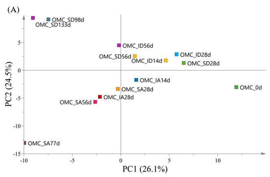 Principal component analysis of volatile compounds in yellowtail ordinary muscle (OMC) during storage under different conditions. The data were pre-processed using an auto-scale. (A) The score scatter plot. The muscle type, storage conditions (IA, ice storage under air; ID, ice storage under deoxygenated packaging; and SA, super-chilled storage under air; under deoxygenated packaging), and storage time (#d) are indicated. (B) The loading plot. The numbers in the loading plot indicate the peak numbers (Supplementary Table S5a–d).