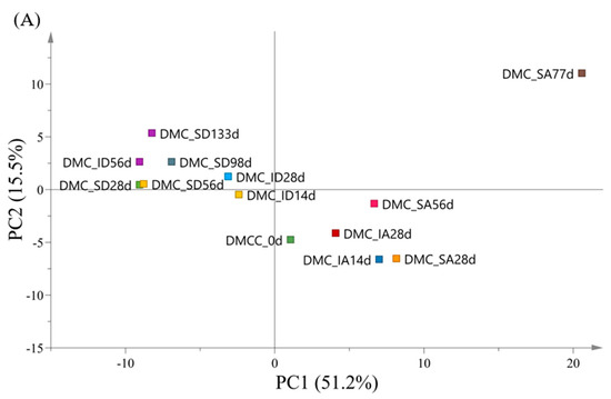 The Weighted UniFrac principal coordinate analysis revealed distinct microbial clustering patterns contingent on the storage duration and packaging type (Figure 2). In AR samples, spoilage-associated bacteria such as Pseudomonas [22,26] became predominant after storage. Consequently, IC samples on day 28 and SC samples on days 56–77 were categorized within the same cluster. Conversely, the DO samples retained a more diverse microbial community throughout storage without the formation of any clusters.