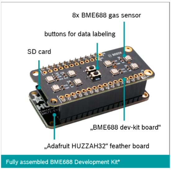 The BME Development Kit is a development platform designed to facilitate the creation of environmental solutions. At its core, the system features the BME688, a compact and low-power gas sensor that operates over a wide temperature range (−40 °C to 85 °C), enabling its deployment in both outdoor and indoor environments. The sensor does not identify specific gases; instead, it measures the total VOCs and provides a unique profile for each gas based on conductivity changes in its metal-oxide (MOX) sensing layer. These profiles can be further processed and classified using BME AI-Studio Software (version 2.3.4) [37]. This enables the training of custom models for odor detection, gas classification, or other specific application scenarios. In this context, applications of the kit can include indoor and outdoor air monitoring, detection of unpleasant odors, food spoilage, and gas leaks.