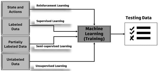 Based on the algorithm procedure, Figure 2, ML can be classified into four distinct techniques: supervised, unsupervised, semi-supervised, and reinforcement learning [43,44].