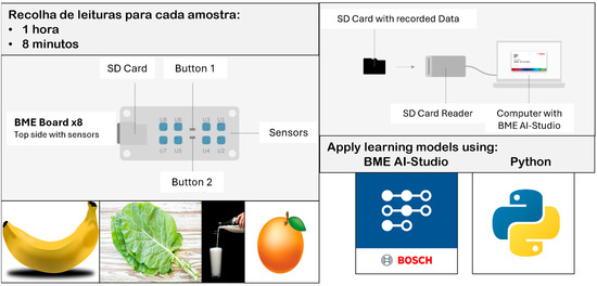 The methodology adopted in this case study involves applying the supervised learning technique. The logic of the food identification process follows the procedure presented in the BME AI-Studio Manual [37], which consists of exploring the use of the BME Development Kit in collecting and gathering readings for each food, followed by the step of assigning classes to measurements corresponding to banana, cabbage, orange, and milk (BCOM). Finally, training classification models were based on data measured by the BME Development Kit.
