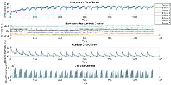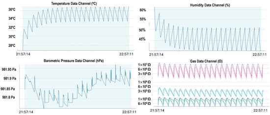Following this study, the eight sensors were designed to collect data according to the standard configuration recommended by Bosch Sensortec (Kusterdingen, Germany), specifically the Combination HP-345/RDC-5-10. The instructions from the manufacturer recommend stabilizing and calibrating the platform sensors since the platform operates within a 12 h period according to the HP-001 profile [37,39].
