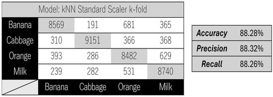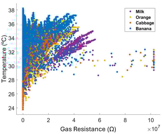 In this way, readings were recorded for 1 h and 8 min for each food, designed to use the HP-345/RDC-5-10 configuration. In the problem context, a reading for a given food, recorded by the BME Development Kit, corresponds to a vector represented by TPHG (temperature, pressure, humidity, and gas) variables. Table 1 presents the number of data samples collected for each food item. Although exact uniformity was not achieved, care was taken to ensure an approximately balanced distribution across the four classes, minimizing the risk of bias during model training.