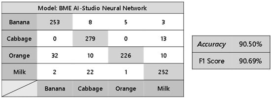 The software was developed specifically for these applications, integrating ML logic into BME AI-Studio by training algorithms based on optimized neural networks. After assigning classes and selecting data, machine learning models are created through the “New Algorithm” menu in the interface. This option opens the environment where the training takes place and, subsequently, validates the classification model for the four foods. The next step is to define the classes equivalent to each food properly labeled, which generates the grouping of information that the algorithm uses to train the model. Then, the model is trained by selecting the “Train Neural Net” option, which starts the process of training and evaluating the prediction model.