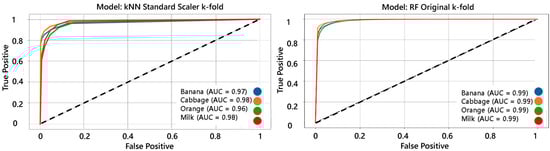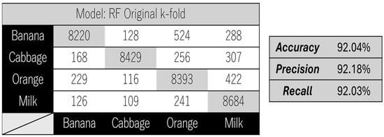 In the analysis of cow milk, the high susceptibility of cow milk to spoilage processes was examined, which can negatively affect its quality. This highlights the identification of aromas through VOCs, which serve as indicators of changes in milk quality during its deterioration. To address this issue, the possibility of detecting different milk samples, fresh, pasteurized, and UHT, was analyzed through their electronic signatures. Different types of milk are distinguished using classification algorithms that use data collected by the BME Development Kit to train various models [50].
