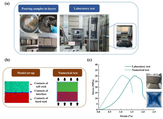 Because natural LCR specimens are difficult to obtain directly from engineering sites, cement–sand-based artificial rock-like materials were adopted to prepare the test specimens [35,36]. The LCR specimens were designed as combinations of soft and hard layers. The strengths of these two artificial rock-like materials were determined by uniaxial compression tests, and the results are listed in Table 1. Each LCR specimen measured 100 mm × 100 mm × 100 mm, with a thickness ratio of soft to hard layers of 1:1. The specimens were cast in layers, with the second layer poured 8 h after the first layer had undergone initial curing. Uniaxial compression tests were conducted using an MTS electromechanical servo universal testing machine at a loading rate of 0.2 mm/min, as illustrated in Figure 1a. A total of six specimens were tested, which exhibited consistent mechanical behavior. Representative results from three specimens are summarized in Table 1. The stress–strain curve of one LCR specimen is shown in Figure 1c. For clarity of comparison with numerical simulations, a single representative experimental curve is presented, given the high consistency observed among the specimens.